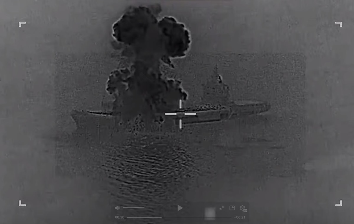 На кадрах видно, що перший потужний вибух стався в носовій частині судна – у районі польотної палуби. Після цього було друге влучення, вже в районі надбудови. Серія детонацій і пожежа, що швидко розповсюджується, призвели до знищення корабля.